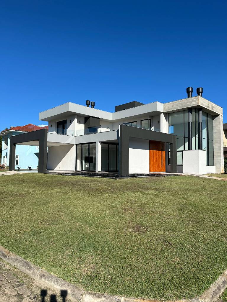 Sobrado, em estilo contemporâneo, composto por 5 suítes (1 master, com closet e hidro - 2 suítes térreas com acessibilidade), terraço com hidro/ofurô, amplo living 3 ambientes com pé direito elevado, lareira, lavabo, cozinha americana, espaço gourmet com churrasqueira, área de serviços, espera para elevador e abrigo para 2 veículos. Espaço gourmet e banho social externo, deck e piscina. 419 m² Posição Solar: Leste/Norte. Pátio privativo, jardim com paisagismo. Localizado no Condomínio Lagoa do Passo, em Osório.